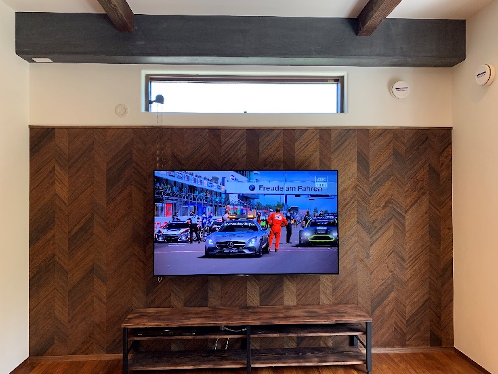 (ご主人)どうしてもやりたかったのが、テレビを掛ける壁のヘリンボーン板張り。木のあたたかい感じとカッコよさが溶け合っていると思います。