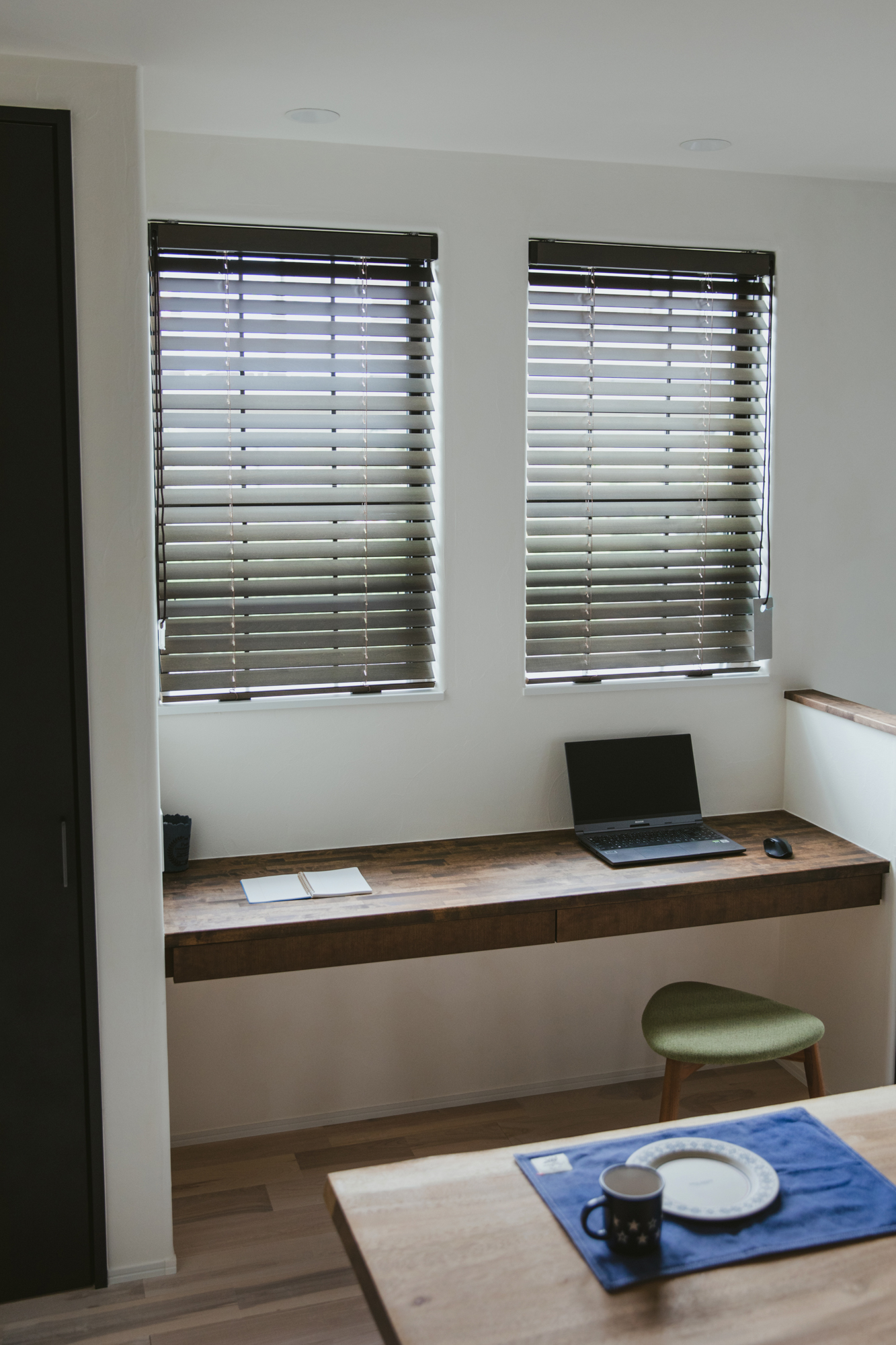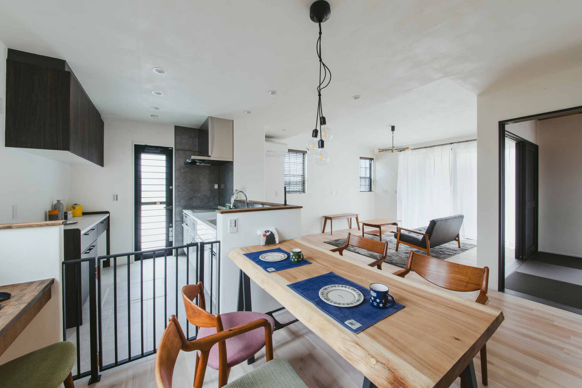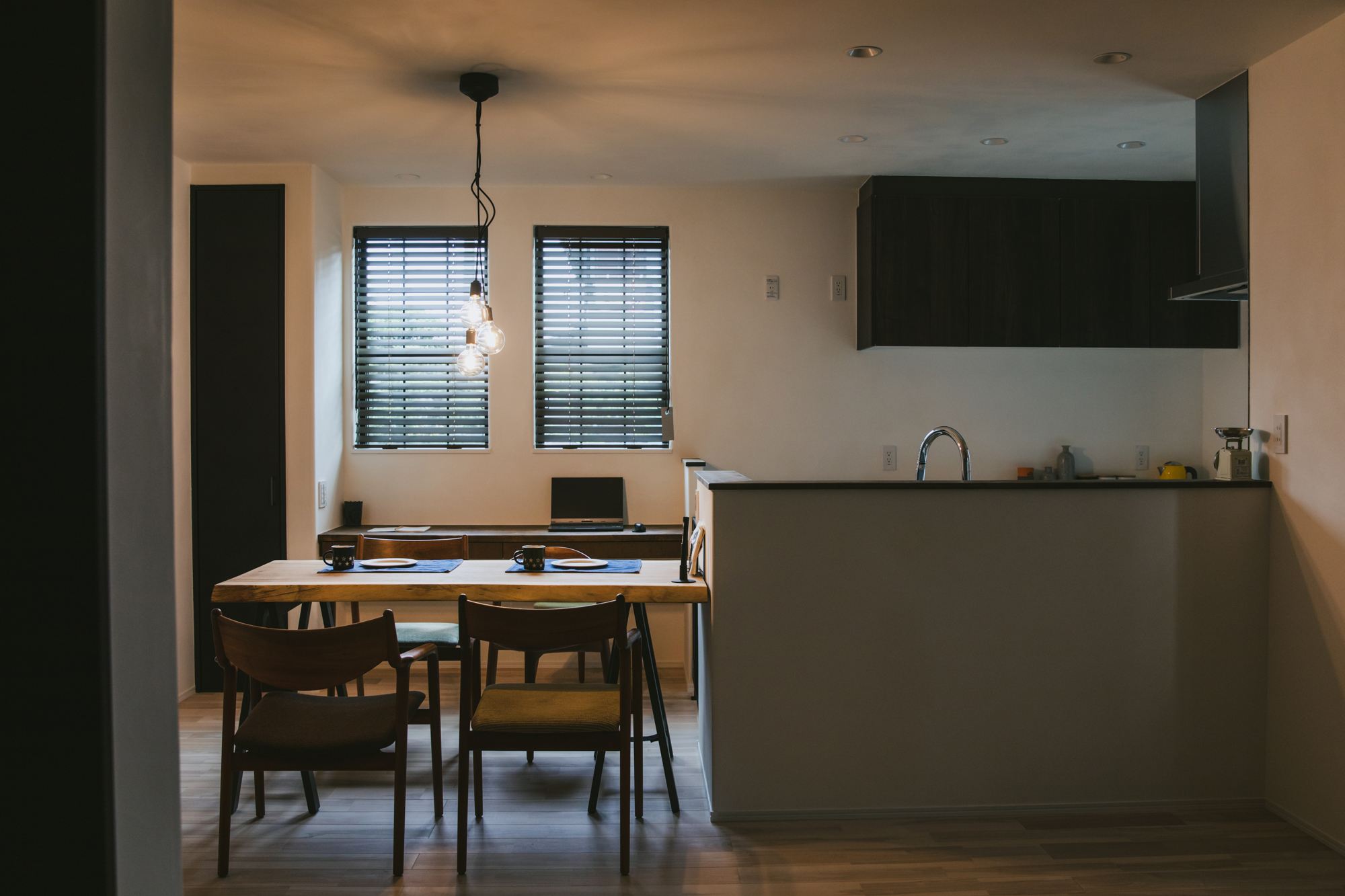 一枚板の造作テーブルに家族が集まるダイニングは、照明の効果も活かしてほっとできる空間にしました。
