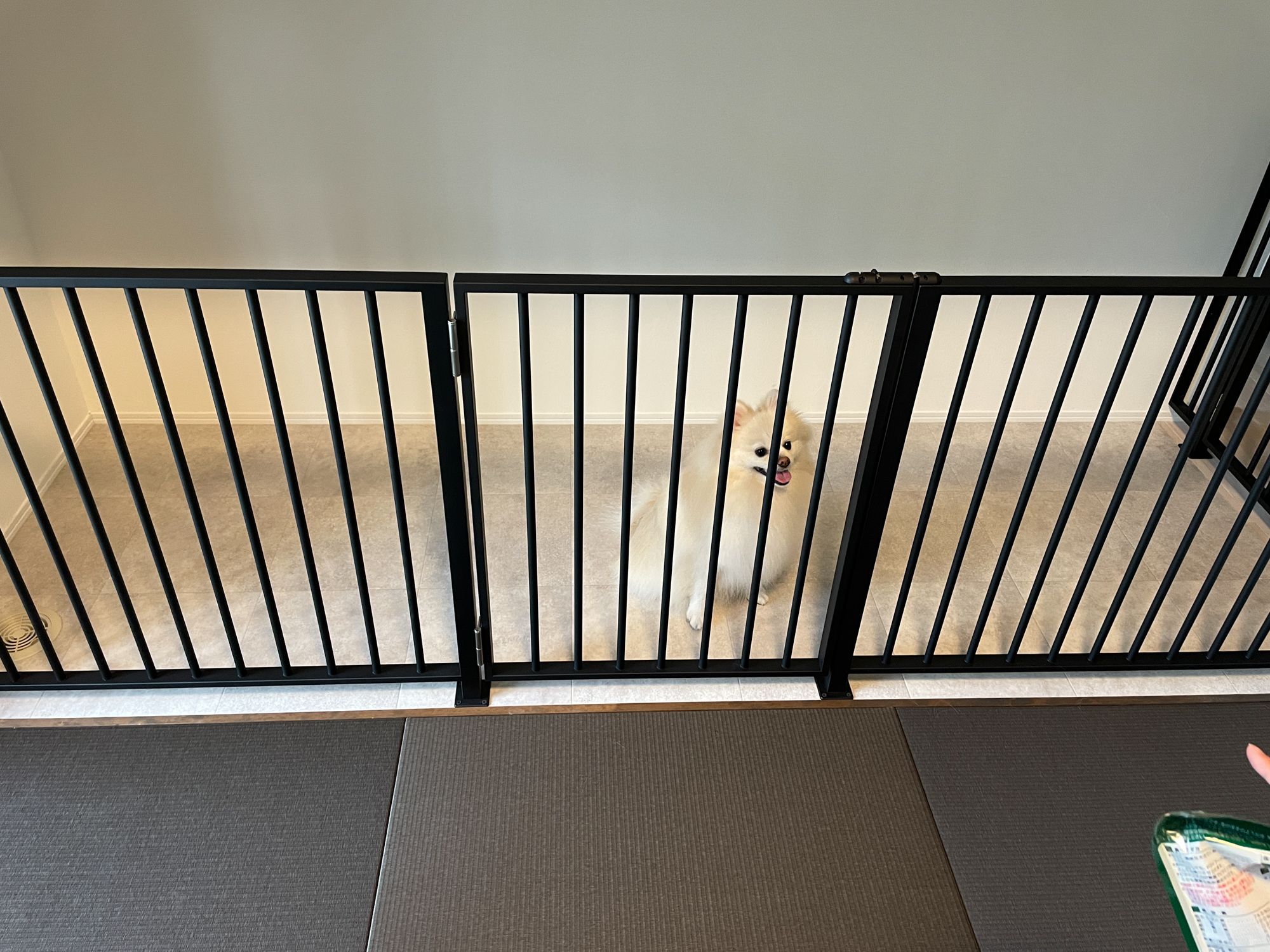 モダンなテイストの畳を取り入れた和室にも、柵で囲われたワンちゃんの居場所を設けてあります。