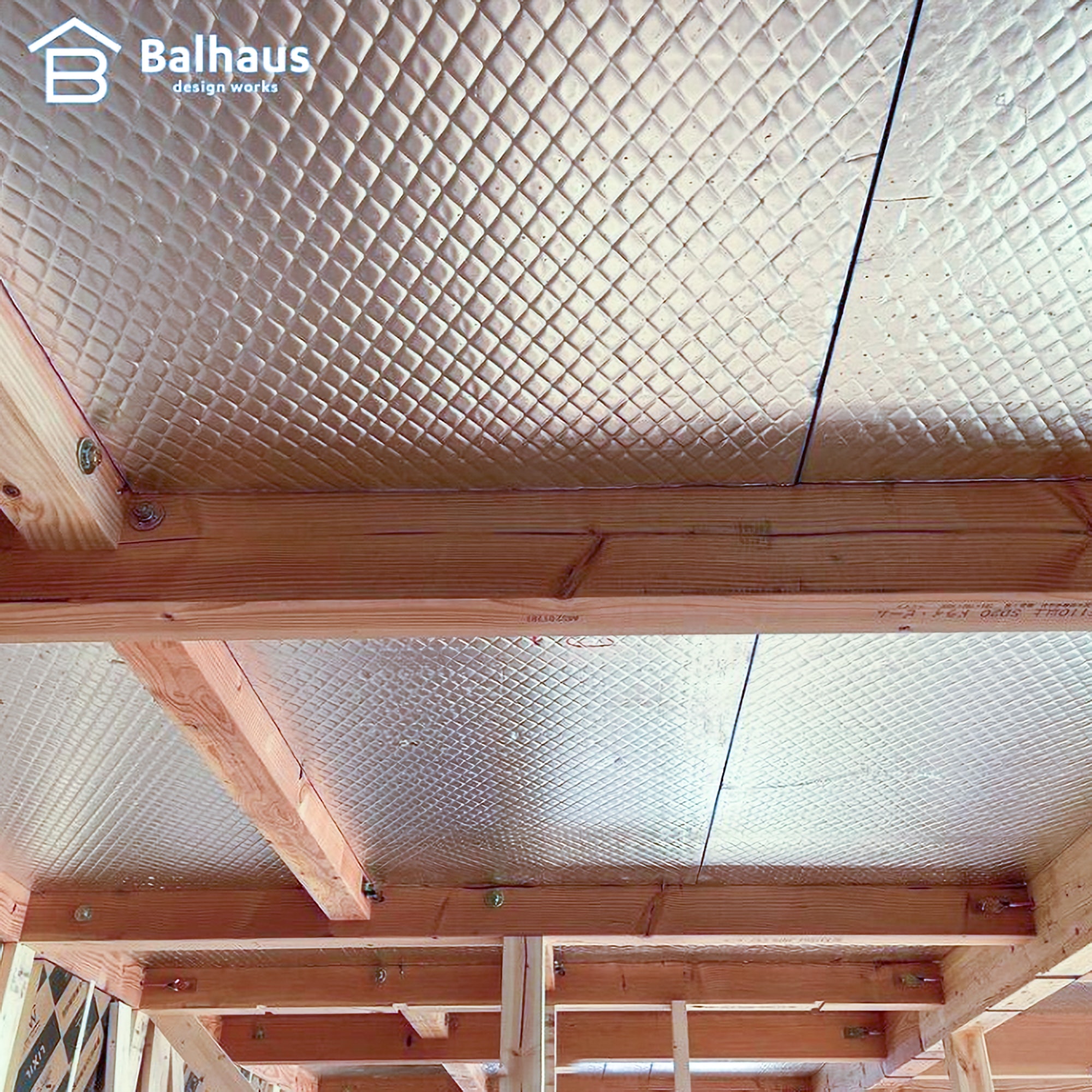 その屋根の熱が家の中に伝わらないように、バルハウスでは熱をカットする高性能なシートを屋根裏(小屋裏)に使っているんですよ。