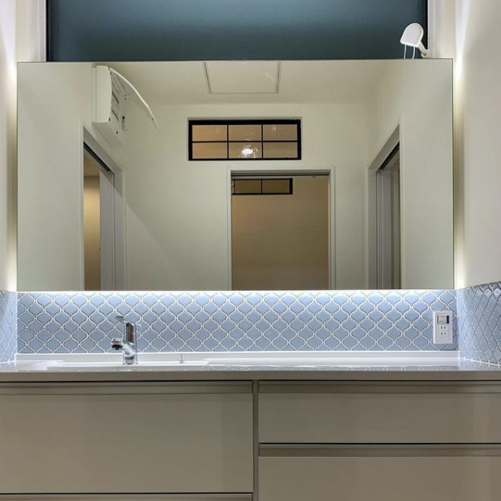 洗面化粧台にはデザインタイルを取り入れ、オリジナル感のある仕上がりにしました。