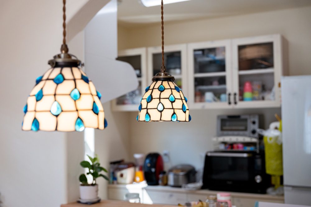 ダイニングにステンドグラスメーカーの照明を採用した例。