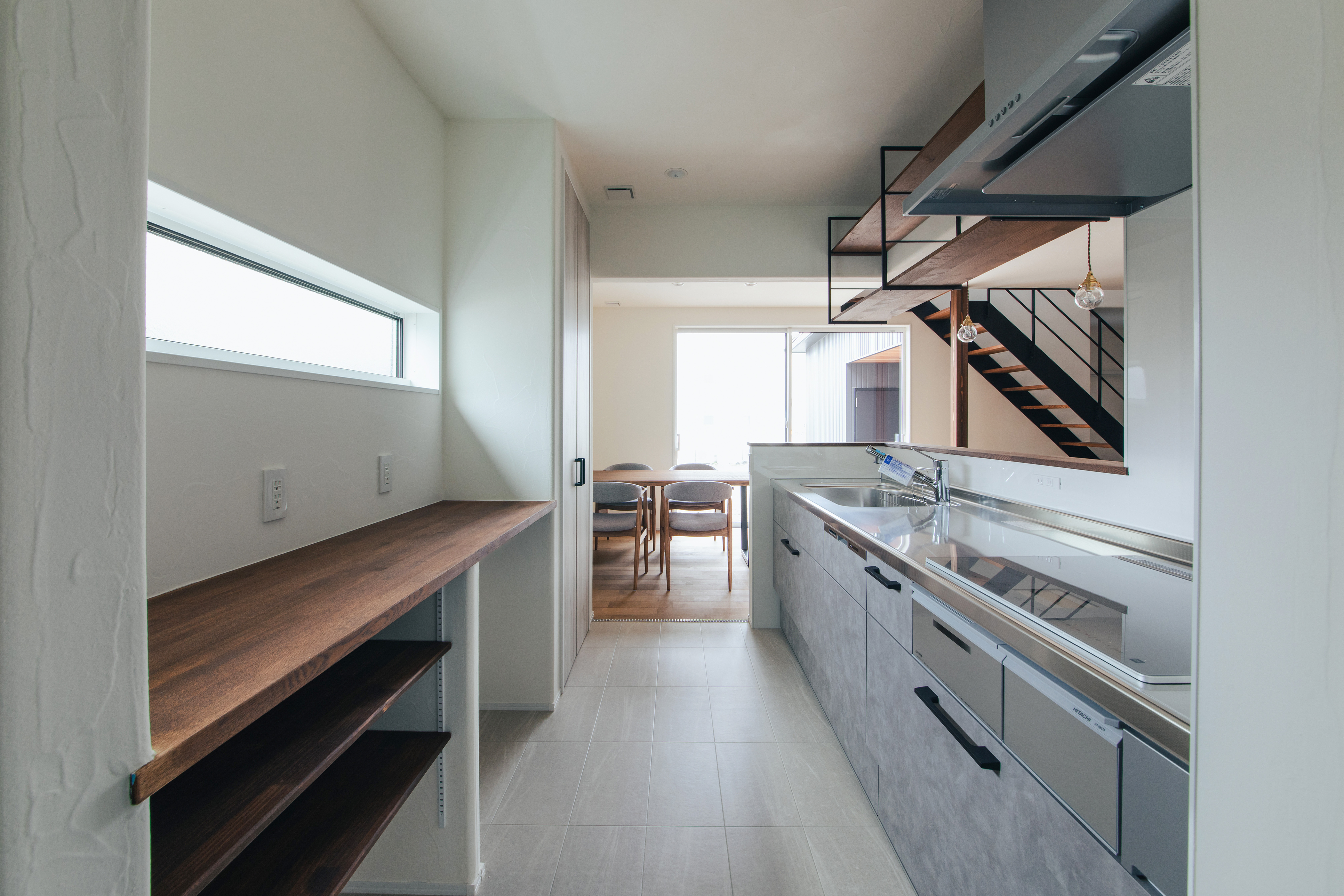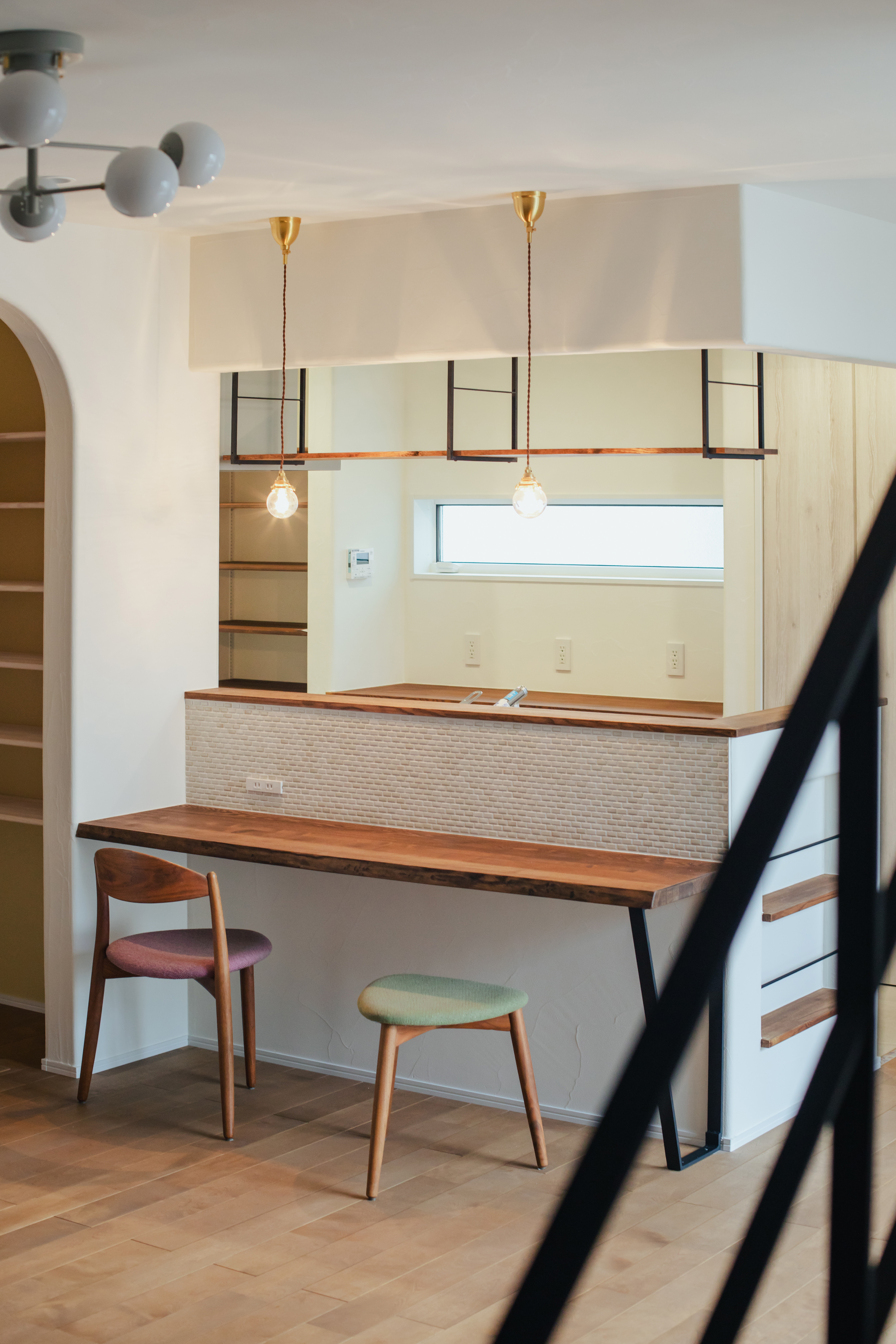 ナチュラルカフェのようなキッチン前カウンター お子様が勉強をしたり・軽食をとったり…キッチンに立つお母さんと会話をしつつ作業のできる空間