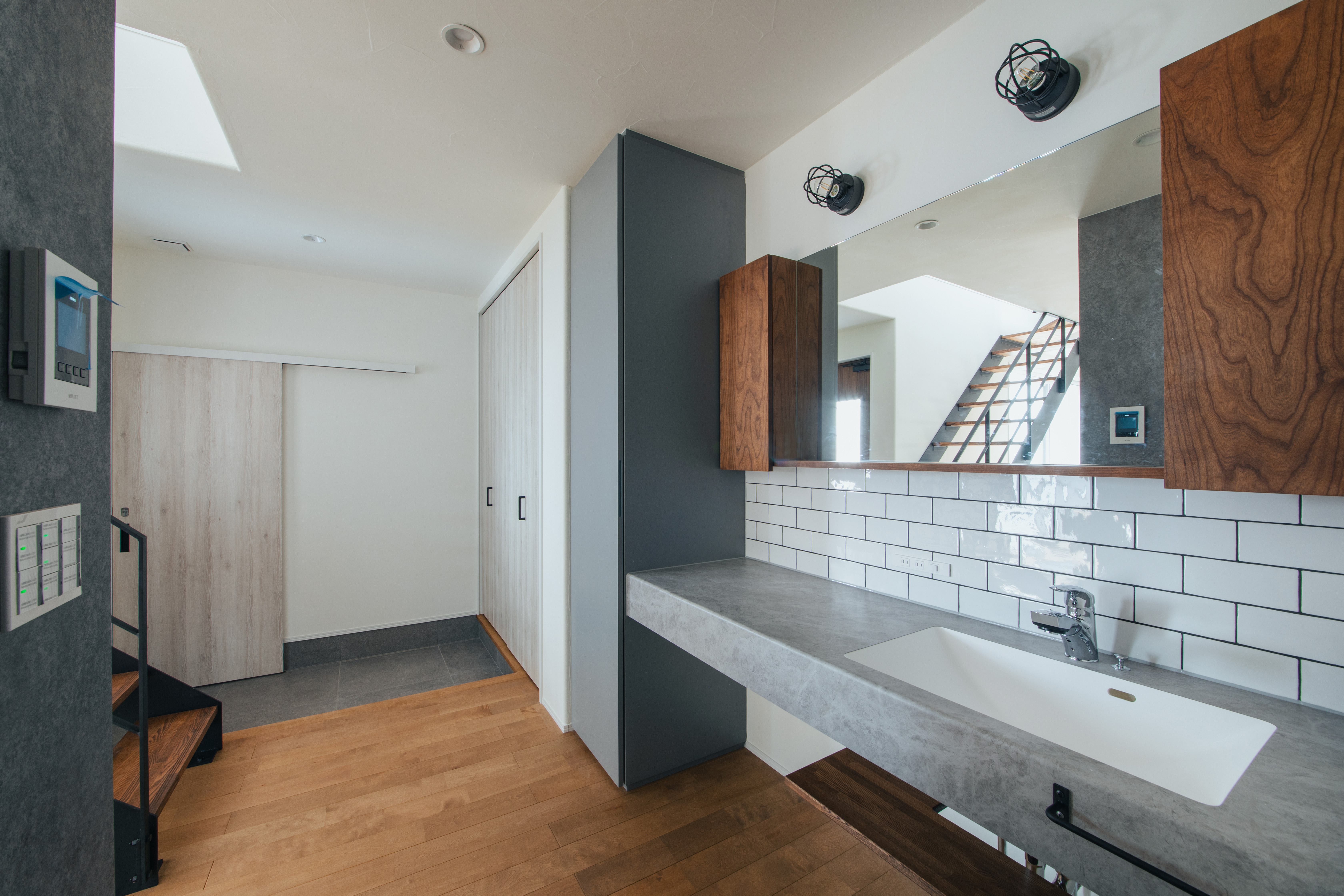 玄関を入ってすぐにただいま手洗いを設置 ホテルライクな雰囲気のおしゃれな造作洗面台 収納も作製をして機能性も兼ね備えた洗面空間
