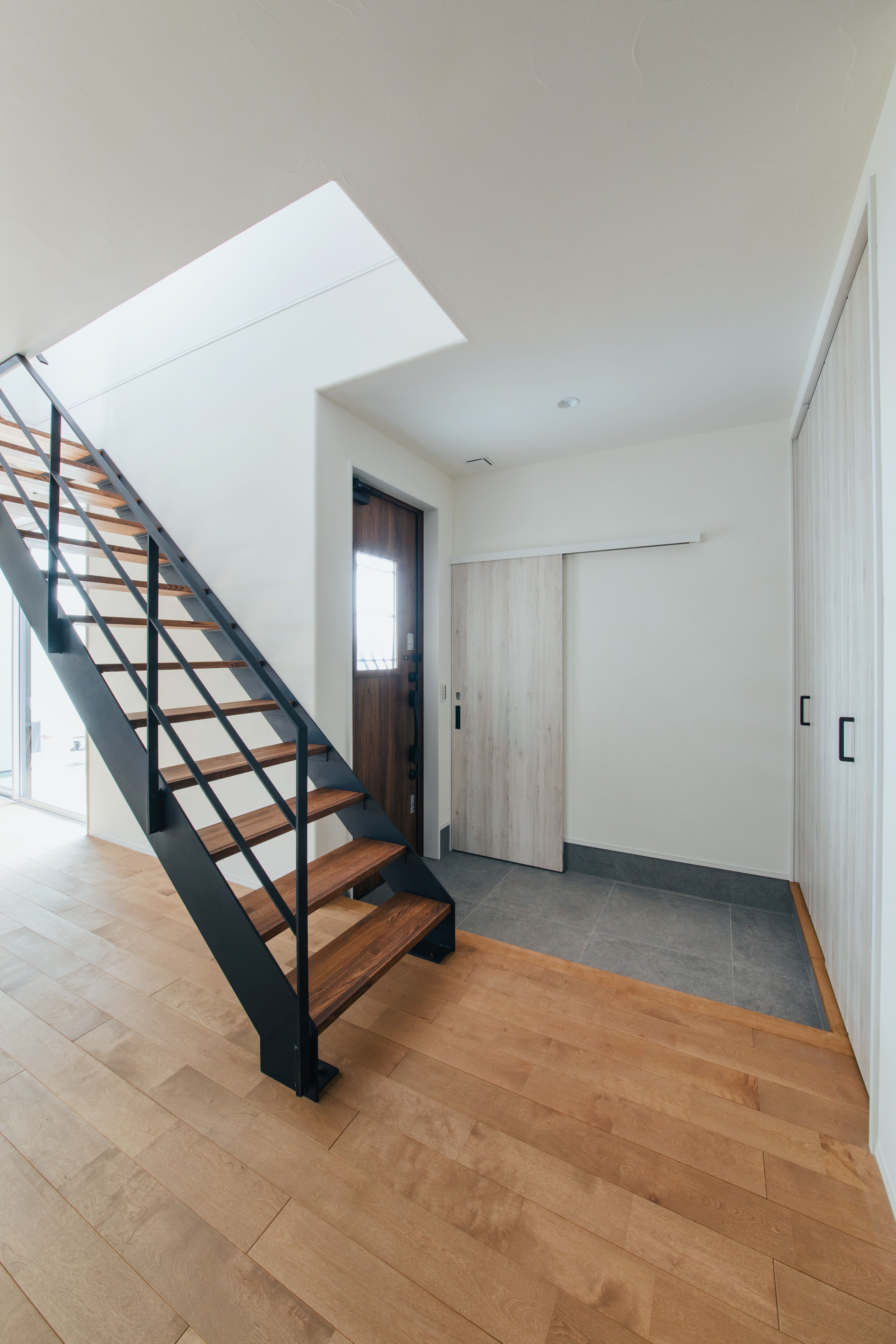 シンプルでかっこいい鉄骨階段が印象的な玄関ホール