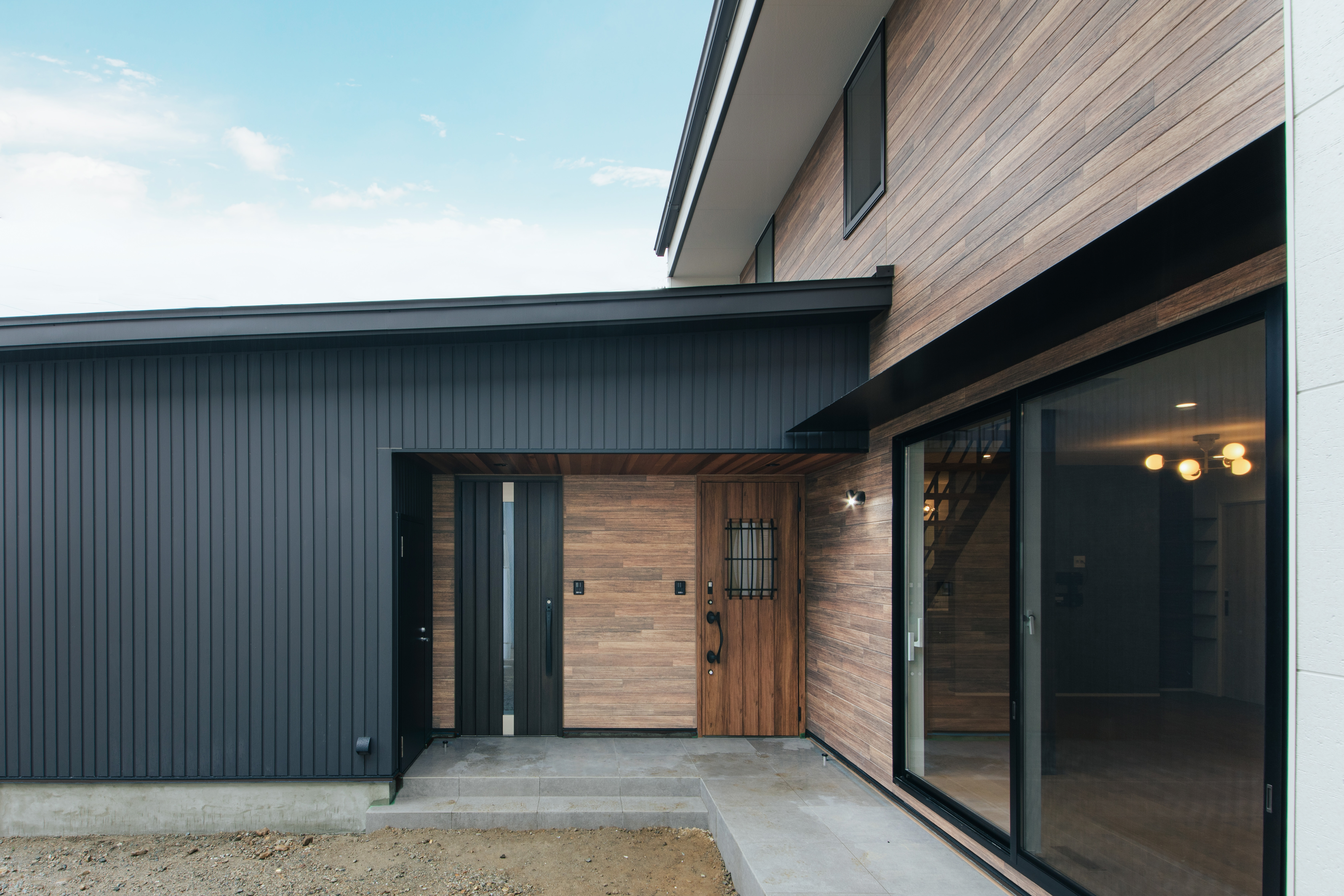 平屋に2階建てをくっつけたような見た目のモダンな外観&玄関はそれぞれに設けました。