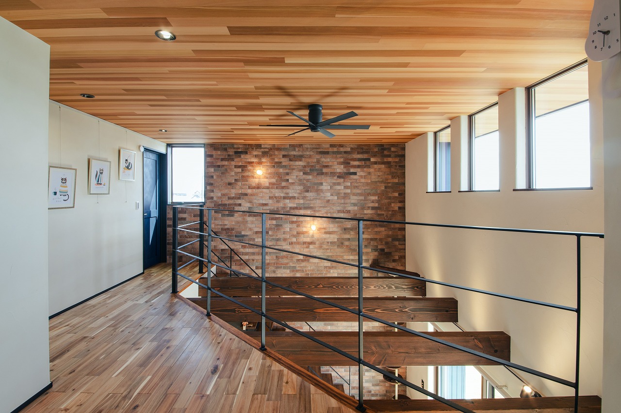 アイアンの手すりですっきりとかっこいい吹き抜けフロア 梁&アクセントレンガの壁がかっこいい