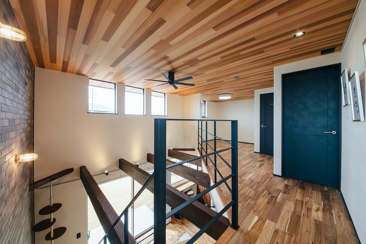 天井のレッドシダーが印象的な2階 外の軒天と繋がって空間のにのびがあるご主人こだわりのポイント