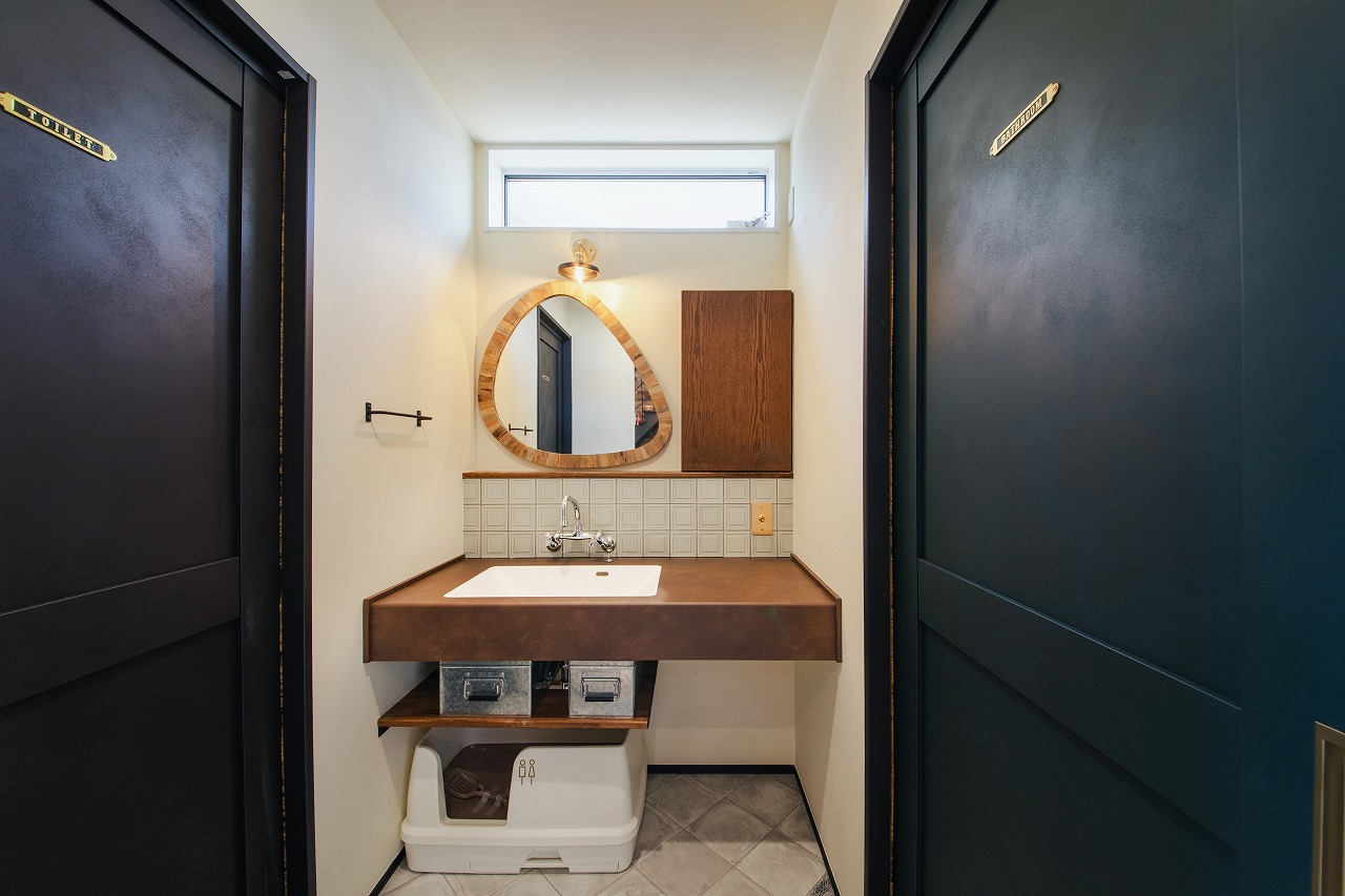 作製洗面台は、お掃除性も兼ね備えたボール&カウンター一体式 また、洗面の下に猫ちゃんのおトイレを収納