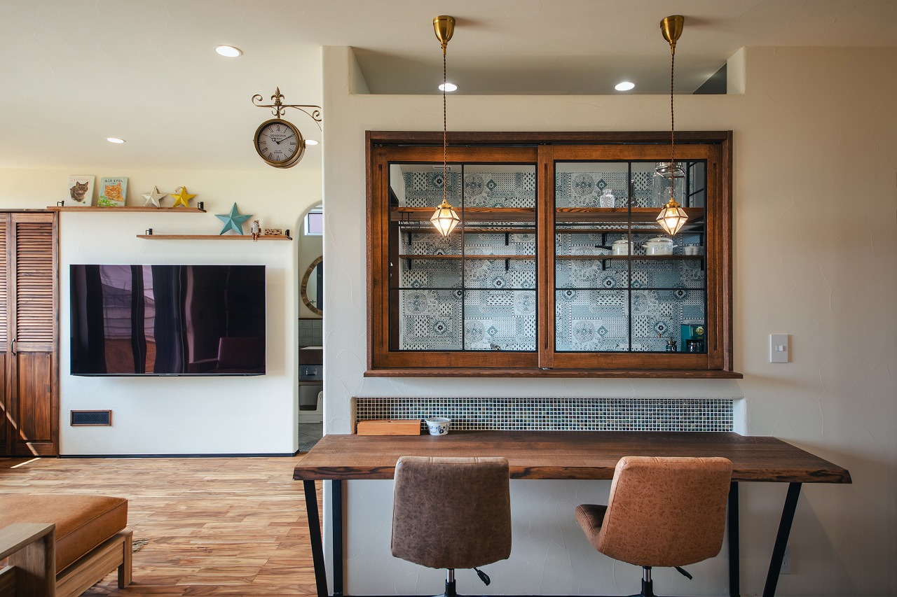 キッチン前のカウンターは、カフェのよう♪猫ちゃんが安全の為にキッチンに入れないようにデザイン窓で区切っています。しかし、キッチンに立つ人が孤立しないように、ガラス窓になっていてまた、空気がこもらないように上部が少し空いているのもポイント!!