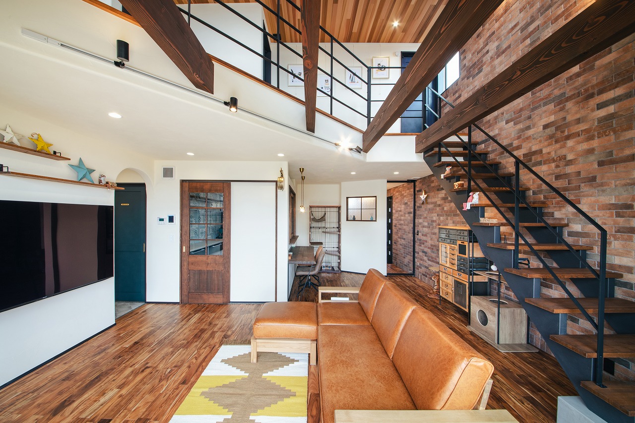 LDK+7帖の吹き抜け 解放感抜群で広々しています。壁一面のレンガタイルもすごく印象的でおしゃれな空間