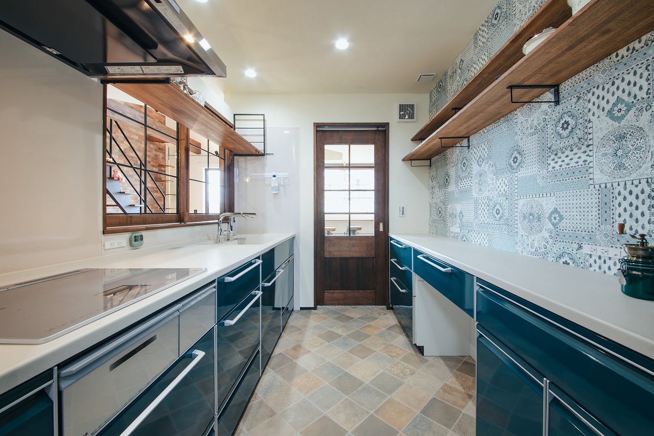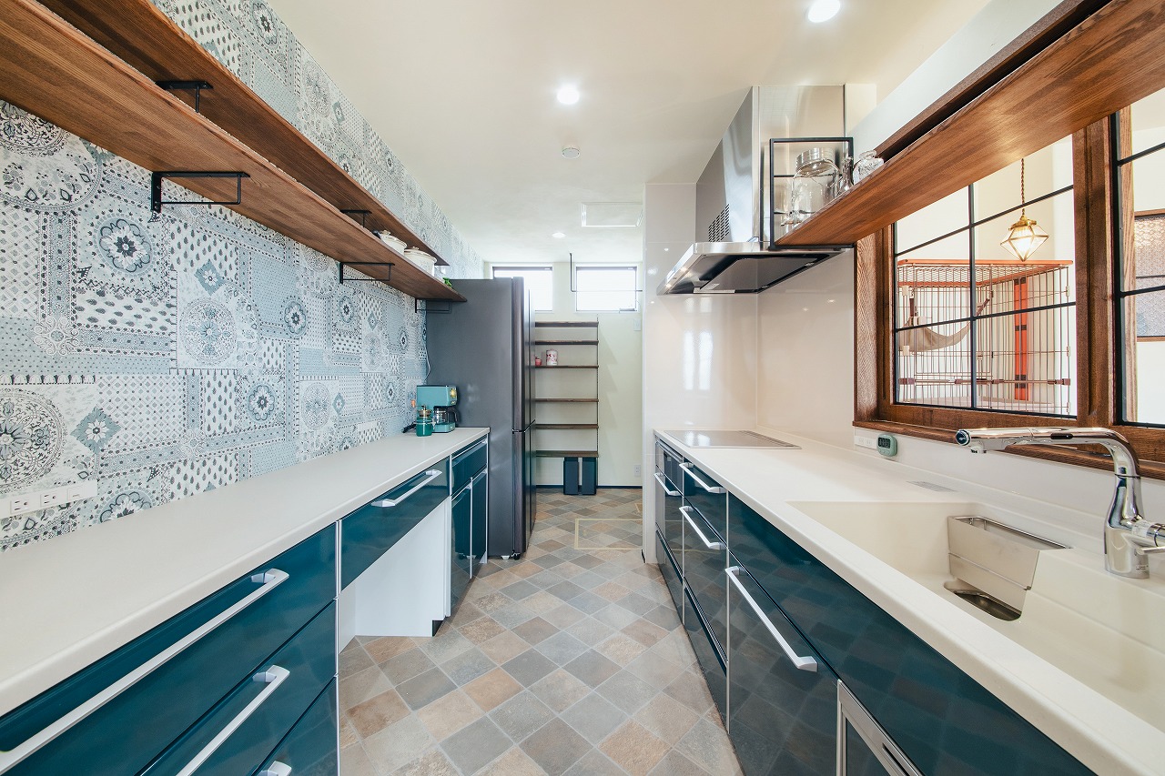 キッチン内もとてもおしゃれ!!背面のクロスもとても悩んだわくわくポイント&キッチンのパネル色も悩みました。バーチャル映像で見る事で踏み出せたデザイン空間!!