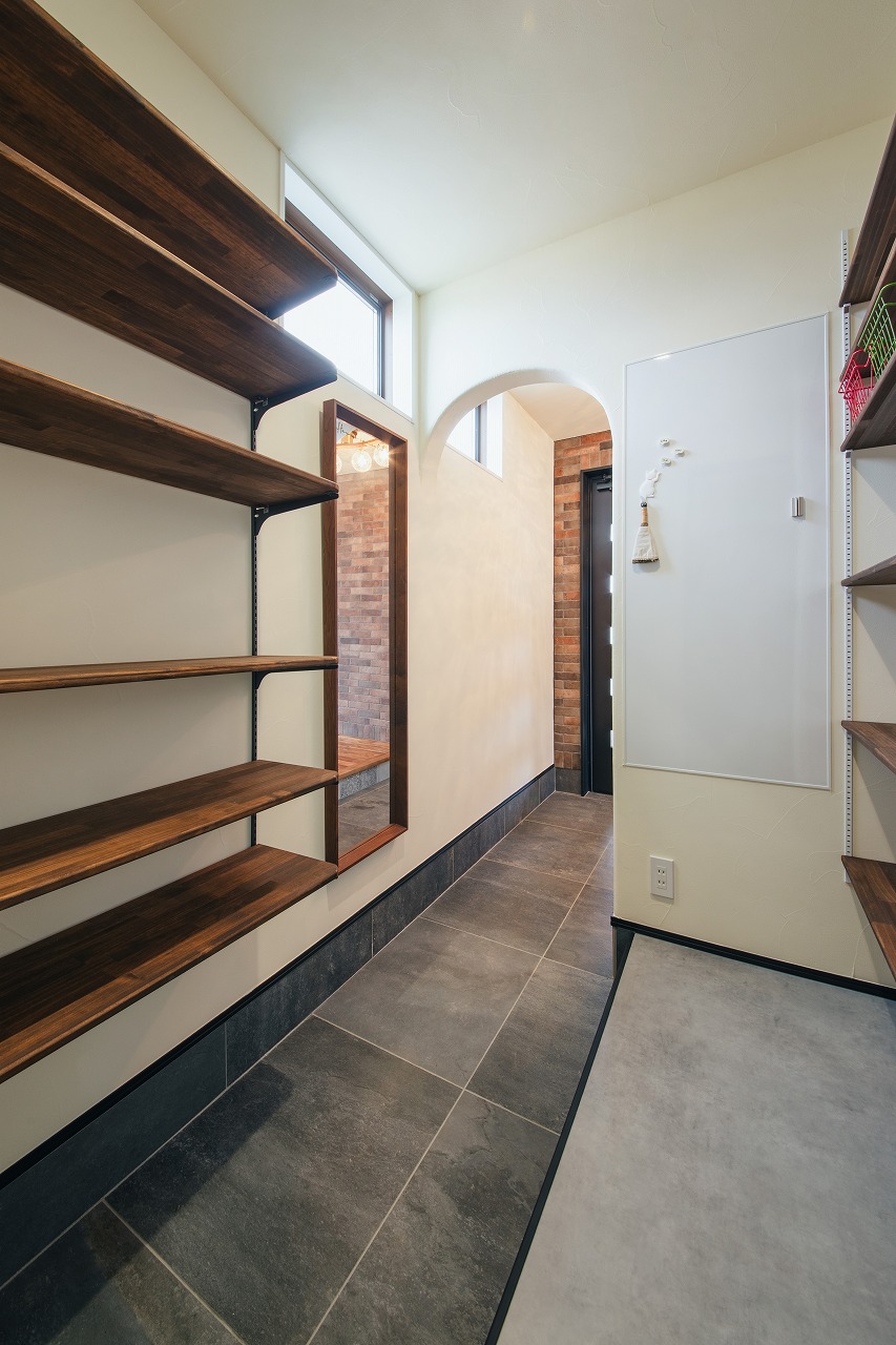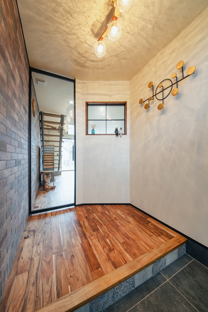 とても印象的な玄関ホールアクセントのレンガタイル&斜めの壁に埋め込まれたアンティークガラスがとてもおしゃれです。また、猫ちゃんの脱走防止の為に、リビング入口を透明なハイドアにしました。
