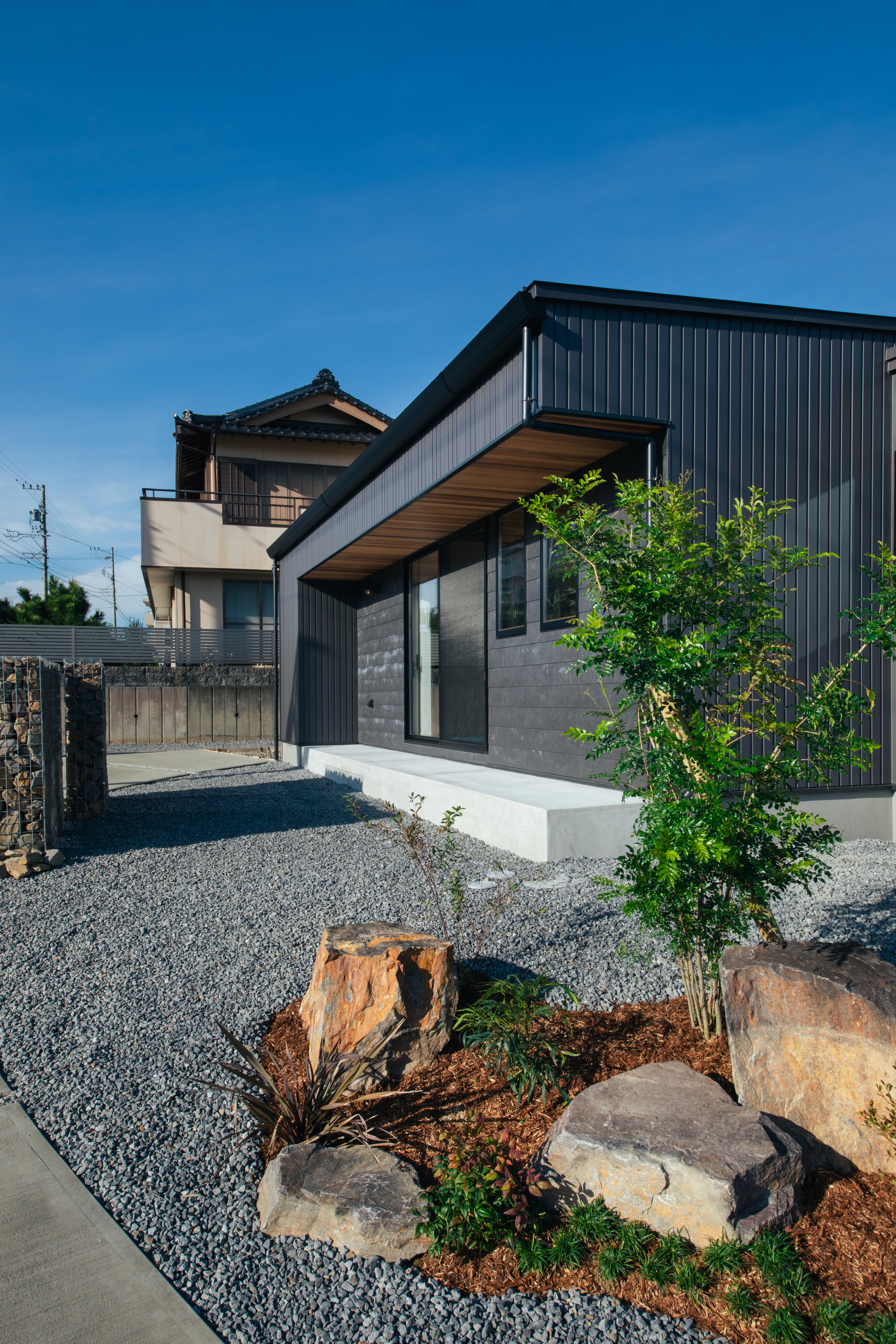 ガルバの黒にソリド。軒天井のレッドシダーとバルハウスらしい素材の使い方。