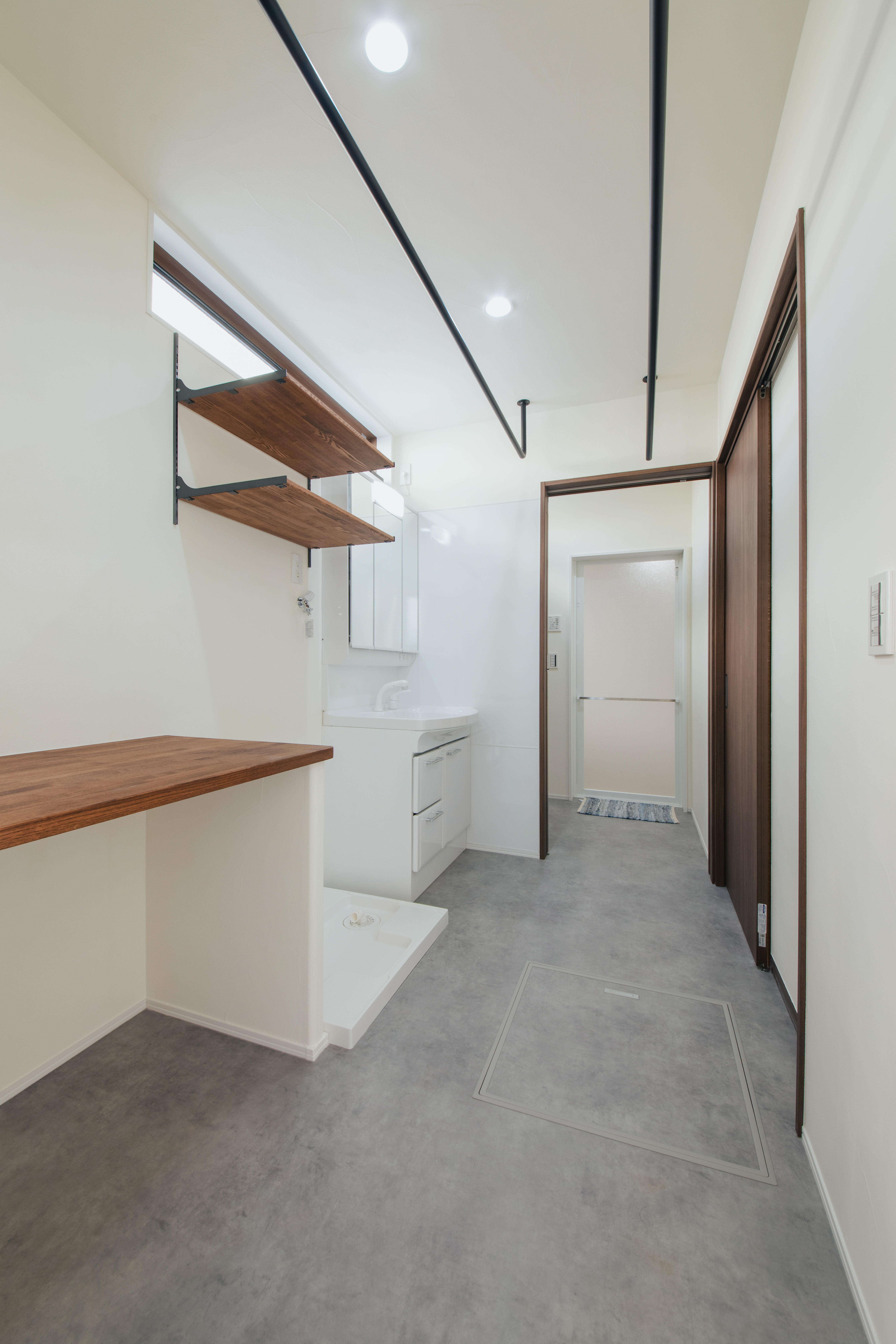 また、ランドリースペースの間取りにもこだわり、脱衣室と室内干しスペースを扉で仕切れるようにし、脱衣室を使用しているときにでも気兼ねなく洗濯物をすることができるようなちょっとした工夫が!!そして、室内だけではやはり干すスペースも限られる為、外にも干せるスペースを一直線上に確保。しっかりと軒が出ている為、急な雨に振り回されないようになっています。