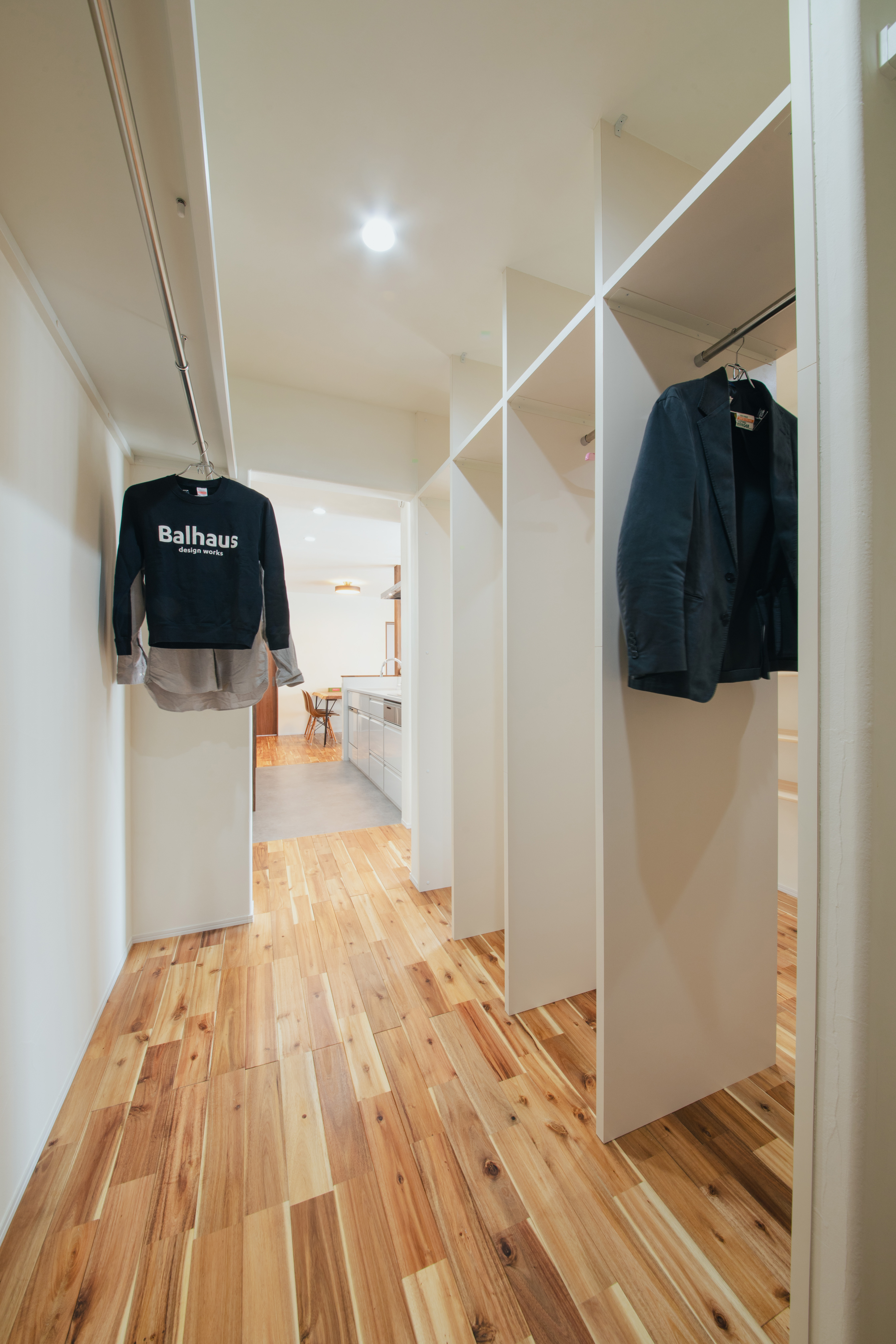 寝室までの廊下を利用したファミリークローク。自分の場所が決まっていて個人のロッカールーム的な使い方。家に帰ってきて玄関からも収納できる!!余分な物は家の中に持ち込まない為きれいに家を保つことが出来ます。