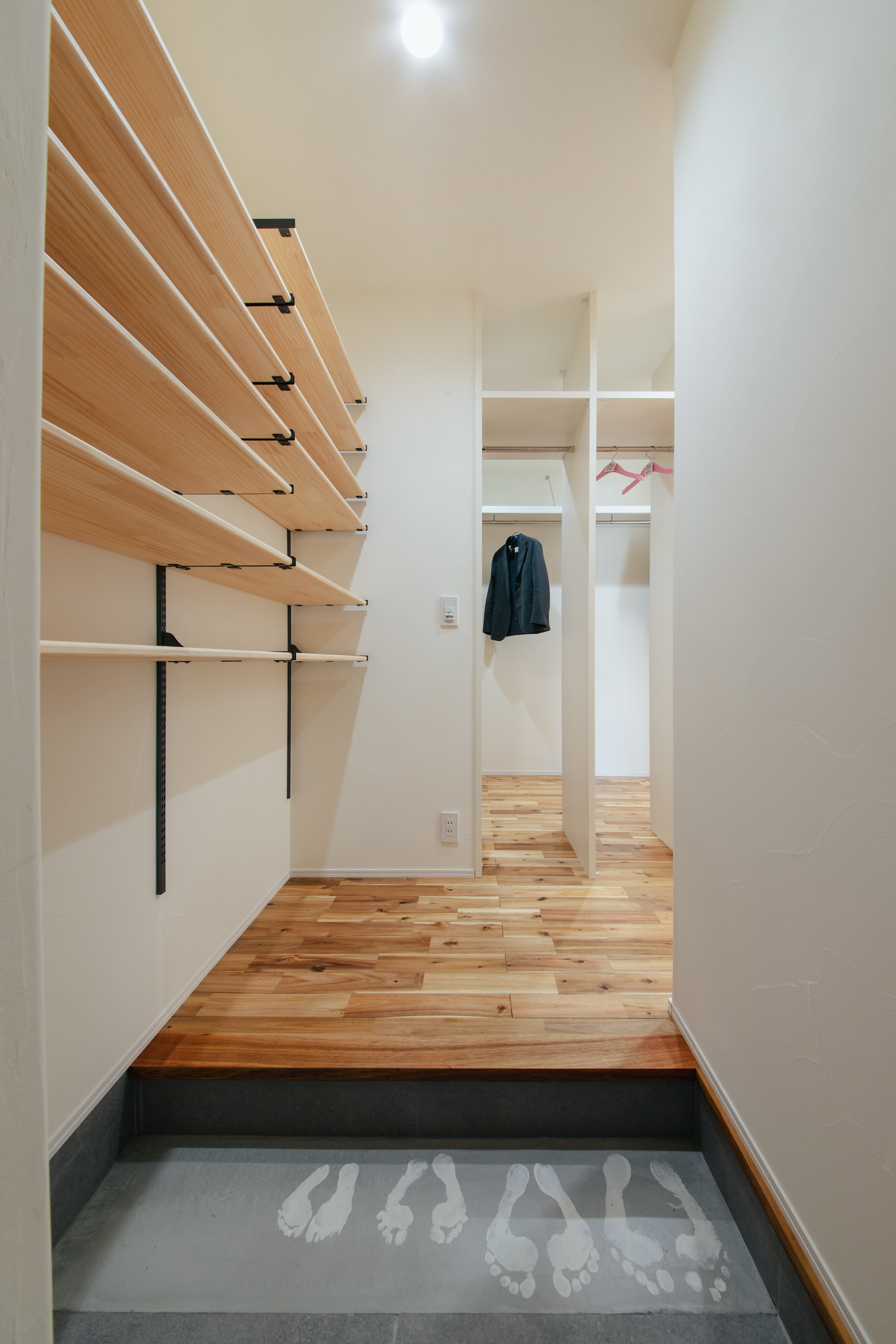 家族の思い出を残した足跡のあるファミリー玄関。自分の靴を置く位置が決まっているからきれいに保てるスペースに。
