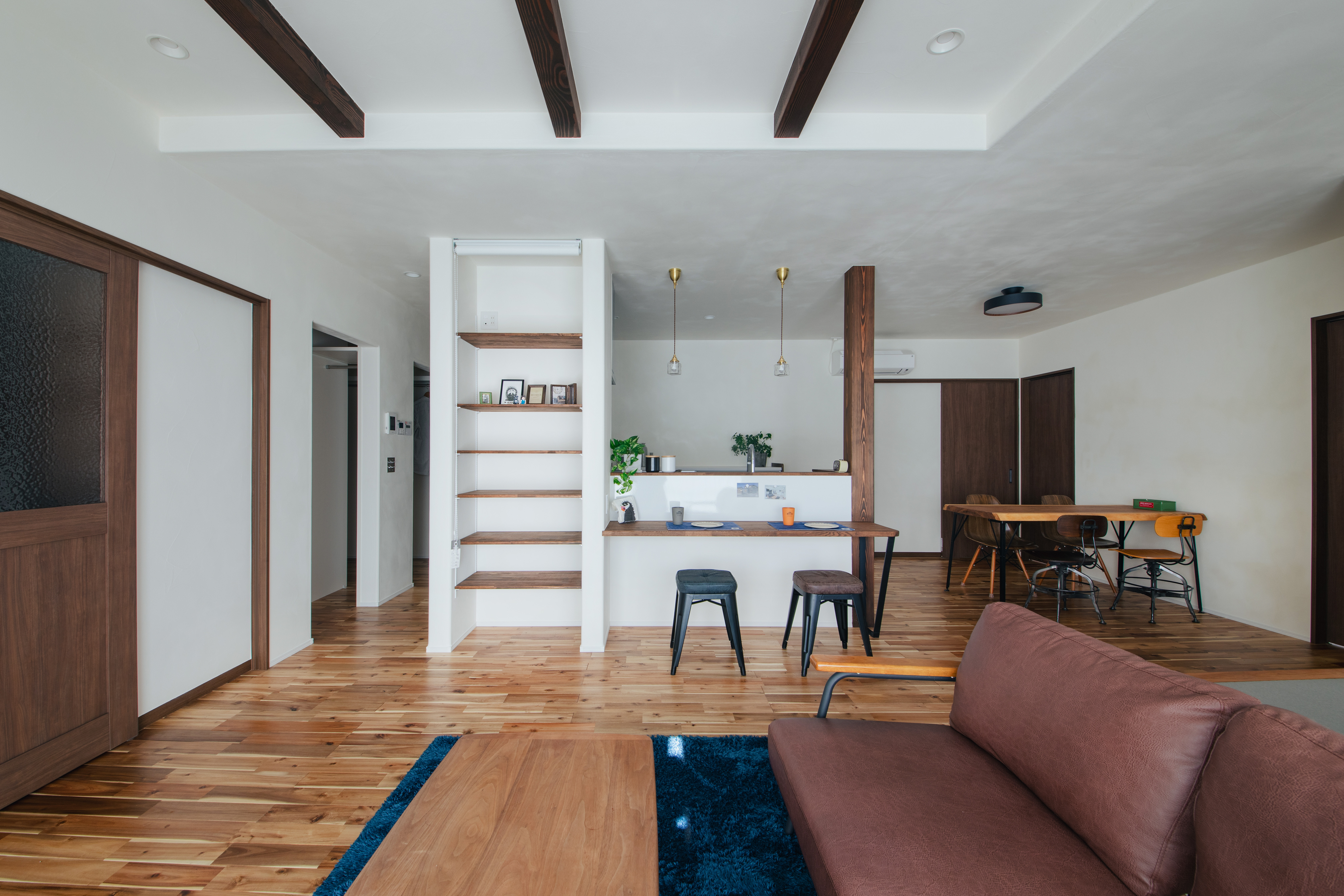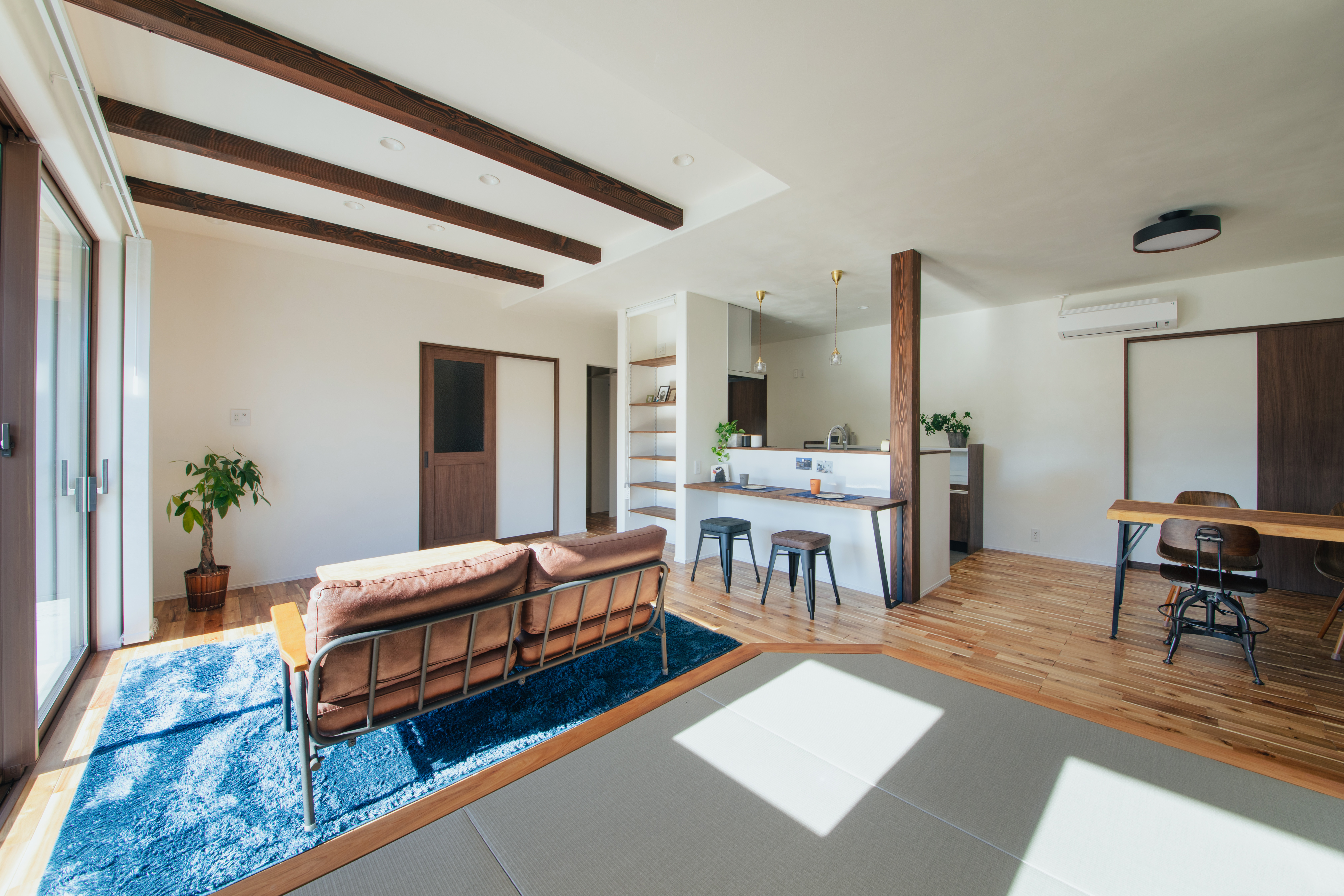 大きな窓に梁を少し見せた高天井 解放感があり明るいLDK 珪藻土に無垢の床と自然素材をふんだんに使用したナチュラルで深呼吸をしたくなる気持ちのいい空間
