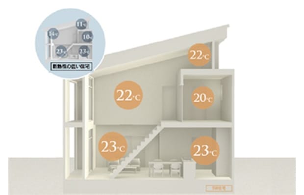上下の温度差が少なければ、例えばエアコンを付けているのに足元だけ冷えるといったことがありません。室内全体が快適な温度となります。