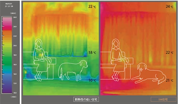 気密・断熱性にすぐれたSW工法の家は、部屋間の温度差が少ないだけでなく、部屋の上下の温度差が少ないことも実証されています。